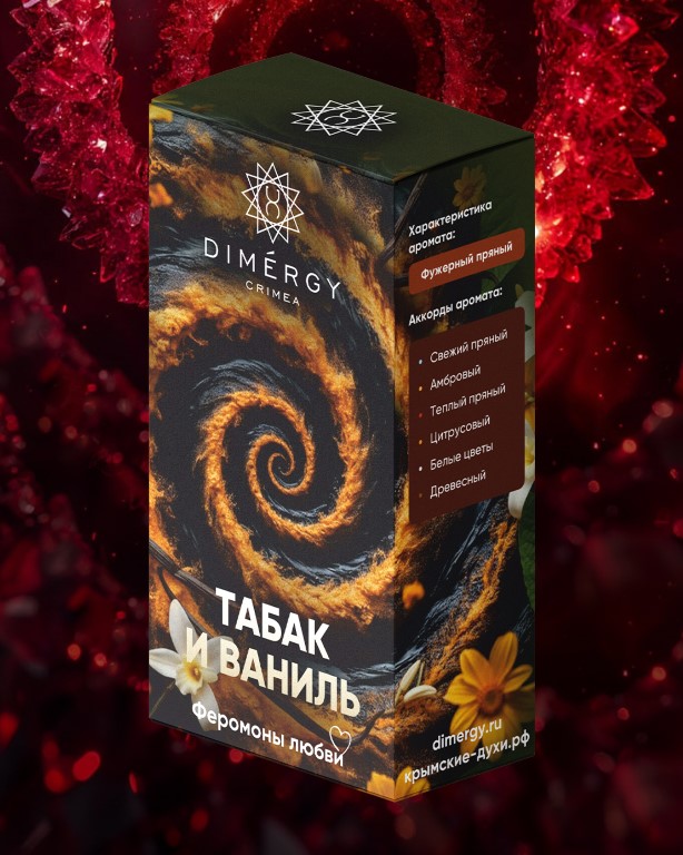Аромат «Табак и Ваниль» — ваше воплощение роскоши. Феромоны раскрывают чувственность, а благородный союз табака и ванили создаёт вокруг ауру уверенности и магнетизма.